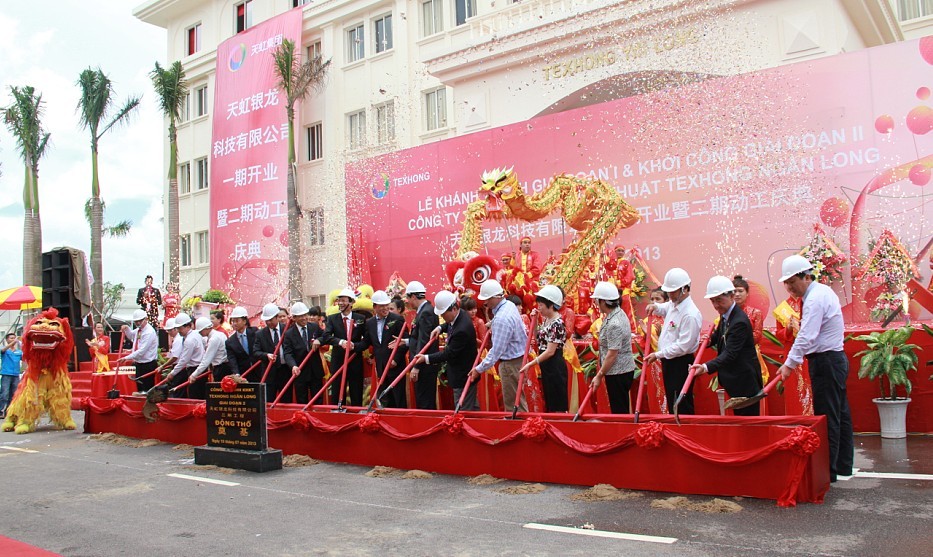7月10 日,天虹银龙科技有限公司隆重举行了一期开业暨二期动工庆典,天虹纺织集团国内外客户、伙伴、中国驻越南大使馆、越南国家计划投资部、广宁省各级政府部门、中国越南纺织协会的领导,天虹集团及天虹银龙科技公司的重要客户、供应商、银行、设计单位、施工单位、货代单位领导以及越南中央、广宁省、香港的各家报纸、电视台的代表和新闻记者等500多人参加了庆典仪式。